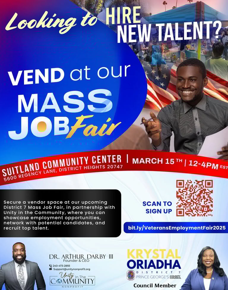 In response to these challenges, our organization hosted the Mass Job Fair 2025 on March 15 at the Suitland Community Center. The event attracted 300+ job seekers, 25 volunteers, and featured partnerships with various organizations.